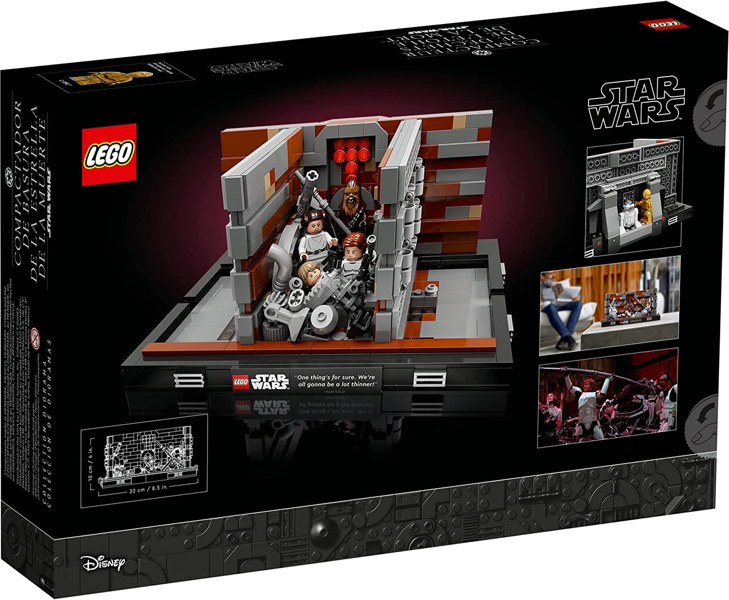 - Authentic details – Includes moving walls, a dianoga’s head, compactor control panel, plus a plaque with Han Solo’s “One thing’s for sure. We’re all gonna be a lot thinner.” line