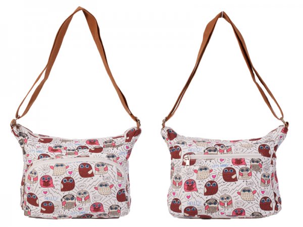 Lilly & Jane Beige Owl canvas shoulder bag with: one main zip compartment with one inside zipe pocket,one large front zip pocket, one back zip compartment and adjustable strap.